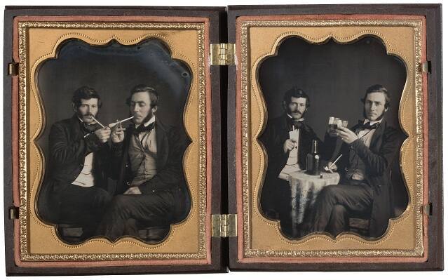 These playful scenes, depicting two men posing with pipes and drinks, were originally conceived as a pair. At some point since their making, the two plates were separated and sold individually. Acquired for the collection from different sources in 1997 and 1998, the two daguerreotypes were reunited in what appears to have been their original presentation case.