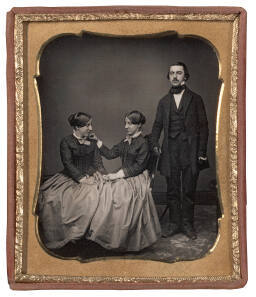 DescriptionImage of two women seated turning to face one another. A man stands next to them with his hand on the back of the chair. The women appear to be identical twins. This sixth plate daguerreotype is housed in a brass mat.