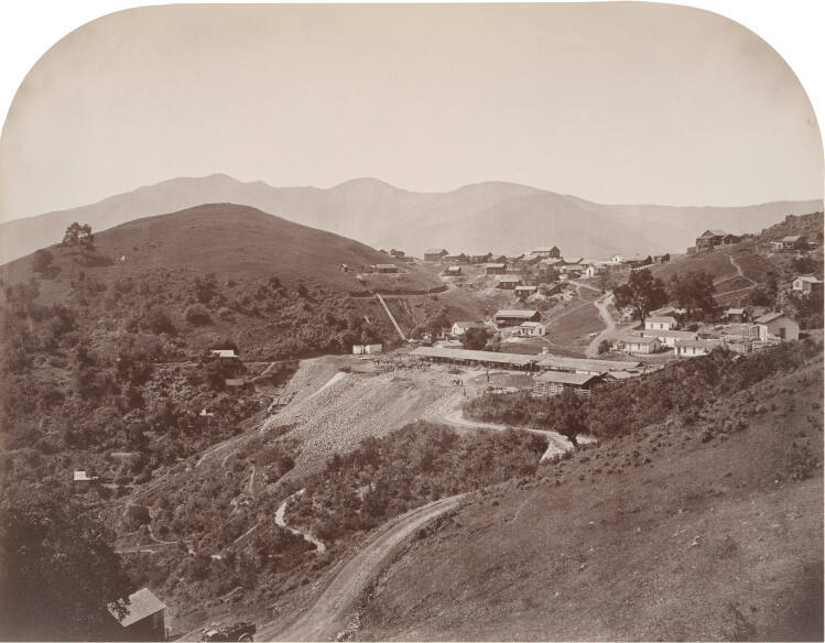 DescriptionImage of a winding dirt road leading up to a mining camp near a rocky hillside; men stand near horses outside of stables with mountains in the distant background.Gallery LabelCarleton Watkins was renowned for his majestic images of Yosemite, which he first visited in 1861, and for the unsurpassed artistry of his 18 x 22-inch mammoth-plate views. In addition to his studies of untouched nature, Watkins was employed to photograph various mining businesses in California. This photograph records the New Almaden Quicksilver Mine outside San Jose. This mine produced mercury, a primary reduction agent in the processing of gold and silver. Ever the artist, Watkins finds compelling visual form in this relatively mundane subject, creating an elegantly rhythmic composition and an exquisite sense of spatial recession.