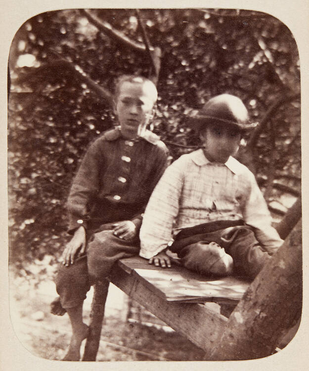 Description: "Tues, Aug. 22, 1882, 10-1/2 A.M., Lawrence & Dewees on their platform, in the apple tree, Warren, R.I."