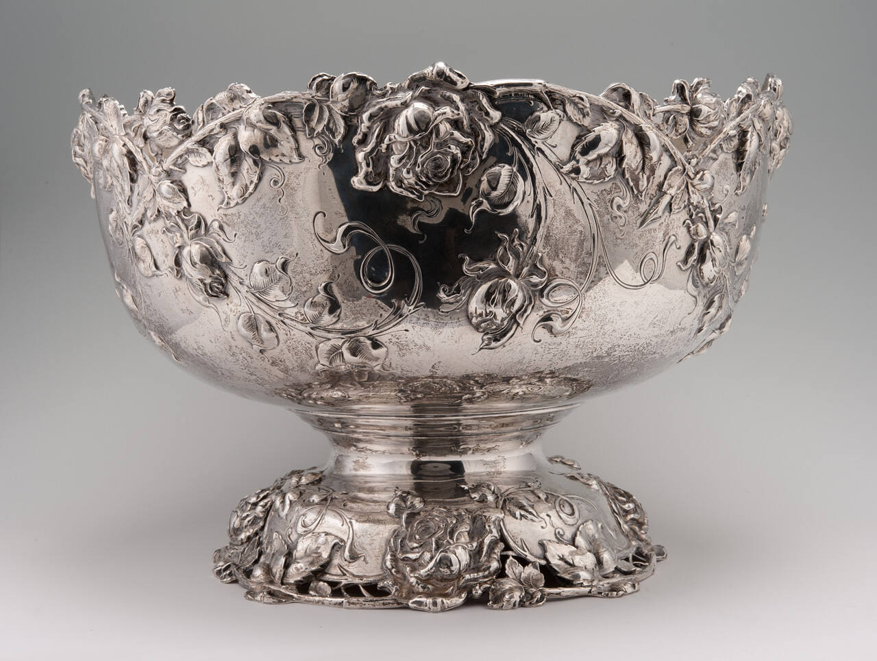 DescriptionPunch bowl has a circular base with a pierced foot ring in the form of rose branches. Cast, applied roses spaced along foot. Body decorated in similar manner with rose blossoms, buds, leaves and tendrils. Monogram "CAH" engraved on side of bowl. Interior finished with gold wash.
