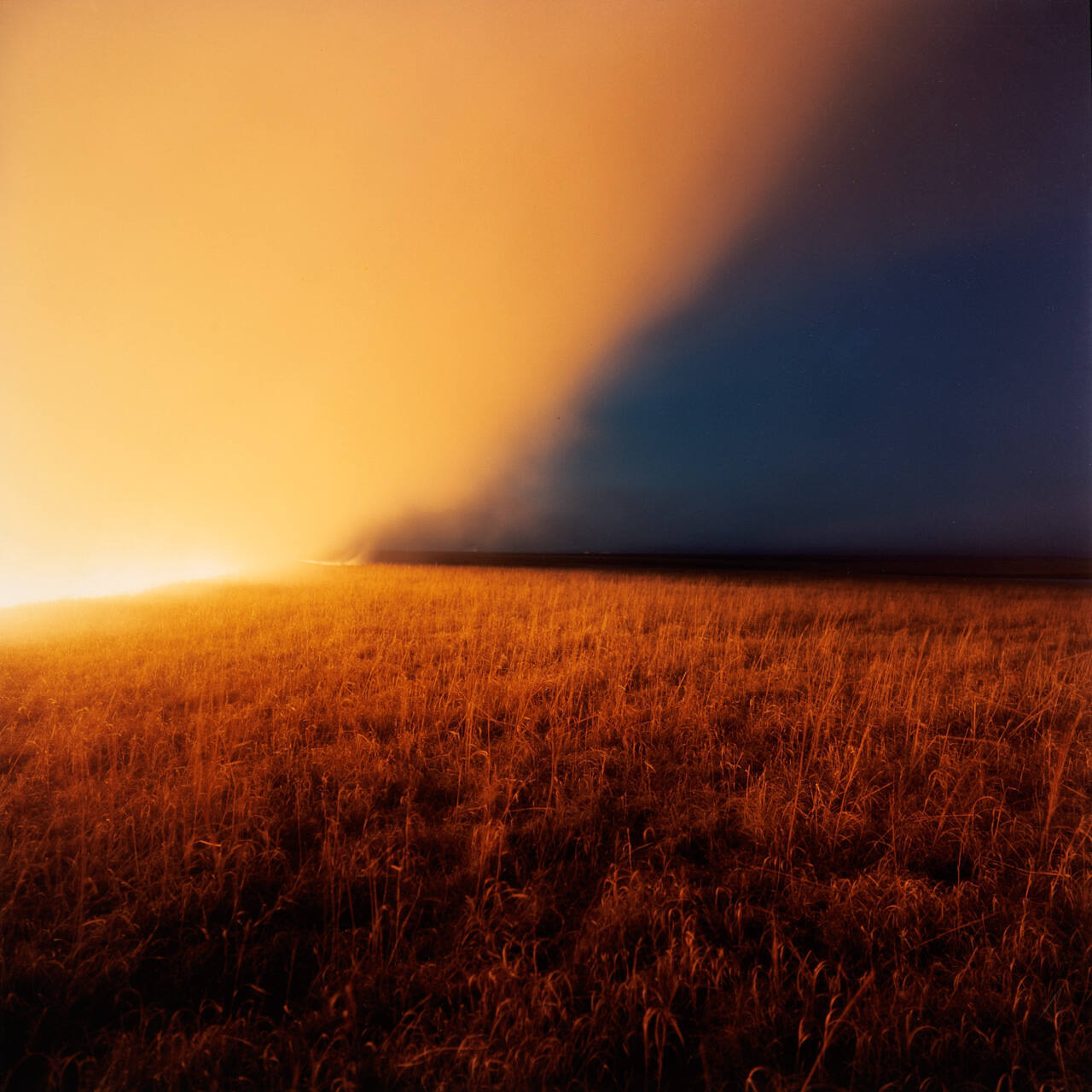 DescriptionA fire on a Kansas plain.Gallery LabelA bright orange blaze illuminates prairie grasslands in this dramatic view of a controlled fire in the Flint Hills of Kansas. Set ablaze every spring to ensure the health of that season’s new growth, these fires help maintain the ecosystem of this federally protected region. In his dramatic view, Larry Schwarm omits any human presence to emphasize the awesome power of nature.