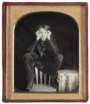 DescriptionImage of a young man, seated on the back of the chair, making a funny face with wide eyes and pursed lips. This sixth plate daguerreotype is housed in a brass mat inside of a brown case with a floral motif and a red silk liner.Gallery LabelComic subjects were popular during the daguerreian era (ca. 1840-1860). Whimsical and witty, they reflected Americans’ love of humor. During the 1830s, the first purely comic almanacs were published. At the same time, troupes of comedic performers and burlesque shows drew large audiences as they traveled around the country.