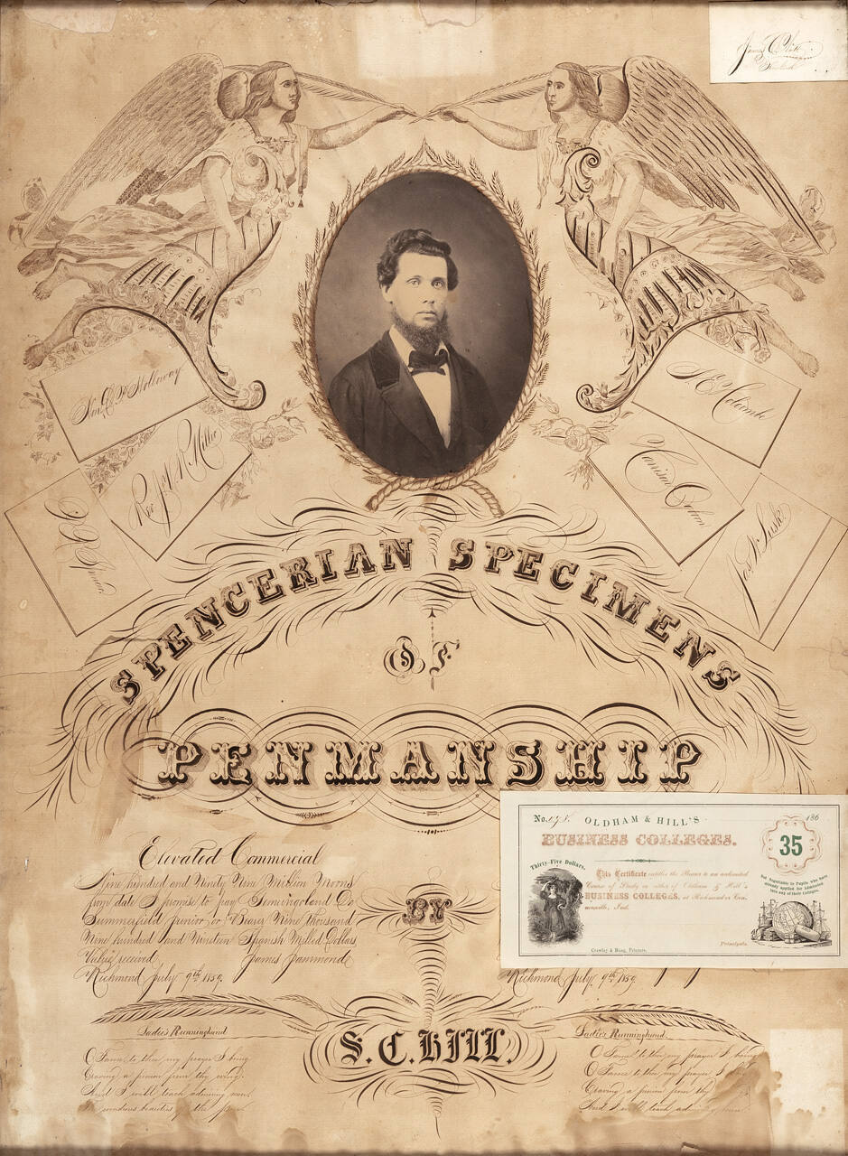 Portrait of Mr. Hill with specimens of penmanship