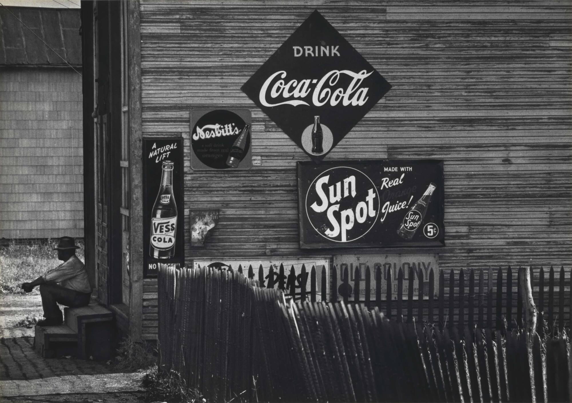 DescriptionImage of the side of a building with soft drink signs displayed on it. A man sits in profile on the front stairs near the lower left and a wooden fence runs across the lower right portion of the frame.Copyright© Estate of James Karales