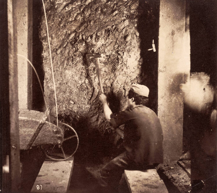 Using burning magnesium tapers to provide "flash" light, O'Sullivan recorded the claustrophobic world of workers in the Gould & Curry and Savage mines on the Comstock Lode. High temperatures, poor air circulation and the constant risk of cave-ins were just a few of the dangers faced by these hardy men. O'Sullivan used his smaller format stereo camera in the mines to make negatives approximately 3-1/2-inches square. From these, he created enlarged negatives more than twice that size, from which these final prints were made. Enlarging in this period was technically difficult and thus rarely done. These prints by O'Sullivan are the finest examples of photographic enlarging from this era.