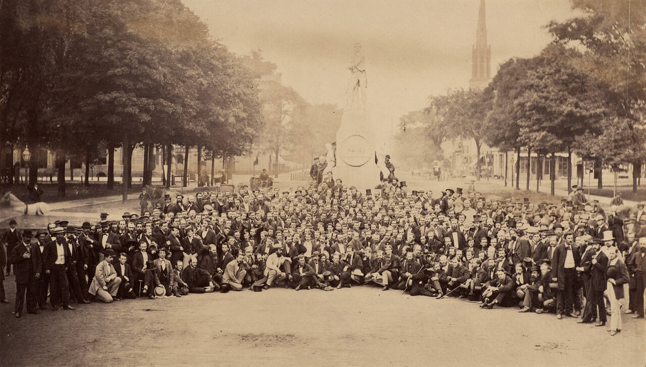 Description: Note language: Congress of American Photographers with one German and two Frenchmen in Cleveland--taken from Superior Street showing the statue of Commodore Perry, the Pres. n Church, Ohio.