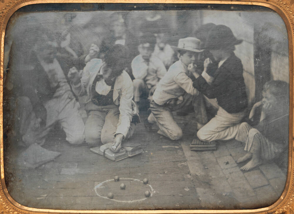 DescriptionImage of boys playing marbles in the alley. This half-plate daguerreotype is housed in a brass mat with an oak leaf and acorn-style motif inside of a small black frame with floral motifs.Gallery LabelThis charming scene, taken outdoors, is unusual in its relaxed, if not entirely candid, composition. Most daguerreotypists worked inside the confines of their studios, with readily available props and skylights that ensured sufficient lighting and proper exposures. When working outside, such controls were less possible, making exposures such as this, which included moving figures, incredibly difficult to achieve.