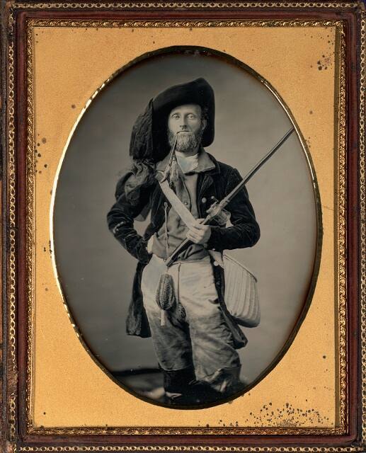 DescriptionImage of bearded man with a satchel draped across his chest as he holds a fishing pole in his left hand. This half plate daguerreotype is housed in an oval brass mat inside of a full leather case with a red velvet liner marked: "North / Artist / Cleveland".Gallery LabelThis subject, an unidentified fisherman, depicts a mid-1800s American character: the gentleman-outdoorsman. This piece might have been made for a display gallery in William C. North's studio to impress clientele. The subject's artistic pose and lighting, as well as the size of the daguerreotype, would have demonstrated the studio's technical and artistic expertise.