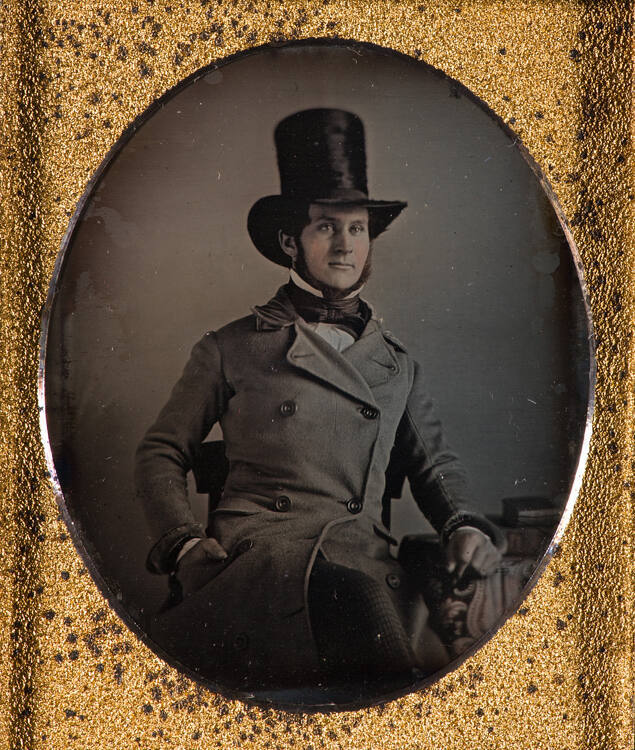 DescriptionImage of a man in a tall hat seated with his right hand in his jacket pocket. He has a neck beard and his cheeks are colored a rosy hue. This sixth plate daguerreotype in housed in an oval brass mat inside of a vertical leather-covered case with a dark silk liner and center clasp.