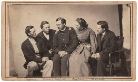 DescriptionImage of five seated figures, one woman and four men. The figures turn toward the man in the center who is wearing a soldier's uniform.