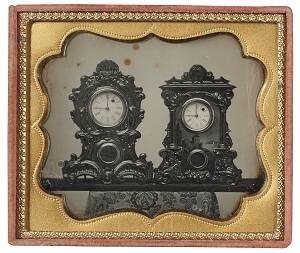 DescriptionImage of two elaborately carved clocks on a platform. Both clocks have roman numerals on their face and read 9:00. This sixth plate daguerreotype is housed in a brass mat inside of a full leather Eichmeyer style case.