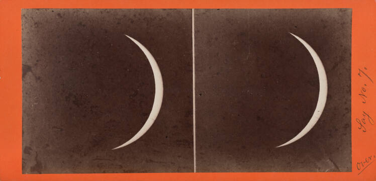 SignedOn mount verso, right edge, white label, in black type: "VIEWS OF THE GREAT SOLAR ECLIPSE, / August 7th, 1869. / From Negatives made by the Philadelphia Photographic Eclipse / Expedition, managed by prof. HENRY MORTON, PH.D., and / under the idrection of Prof. J.H.C. COFFIN, U.S.N., / of the Nautical Almanac Office, Washington, D.C."