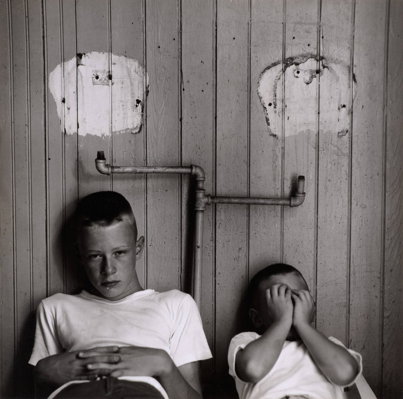DescriptionVintage gelatin silver print; trimmed & mounted; image of two boys leaning against wall with disconnected pipes.Copyright© Estate of Ralph Eugene Meatyard