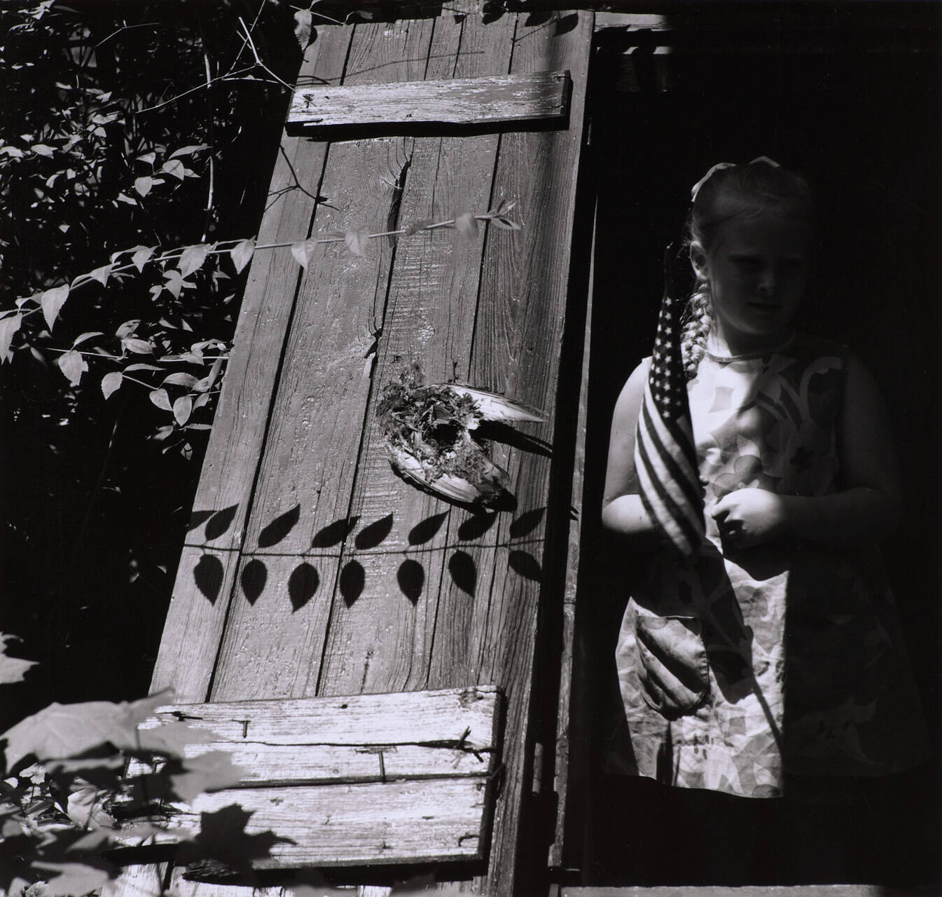 [Girl in cellar door with flag]