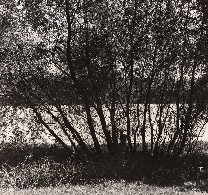 DescriptionVintage gelatin silver print; trimmed & mounted. Image of girl seated in shadows of trees.