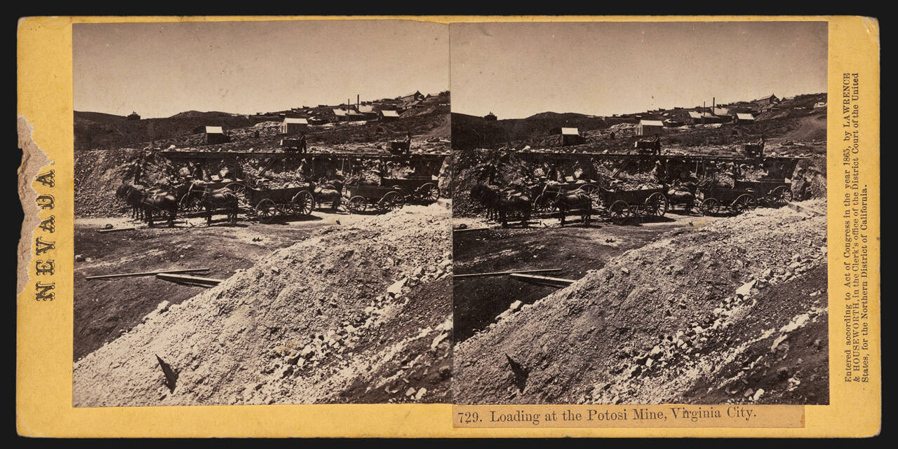 On mount recto, lower right, in black type: "729. Loading at the Potosi Mine, Virginia City."