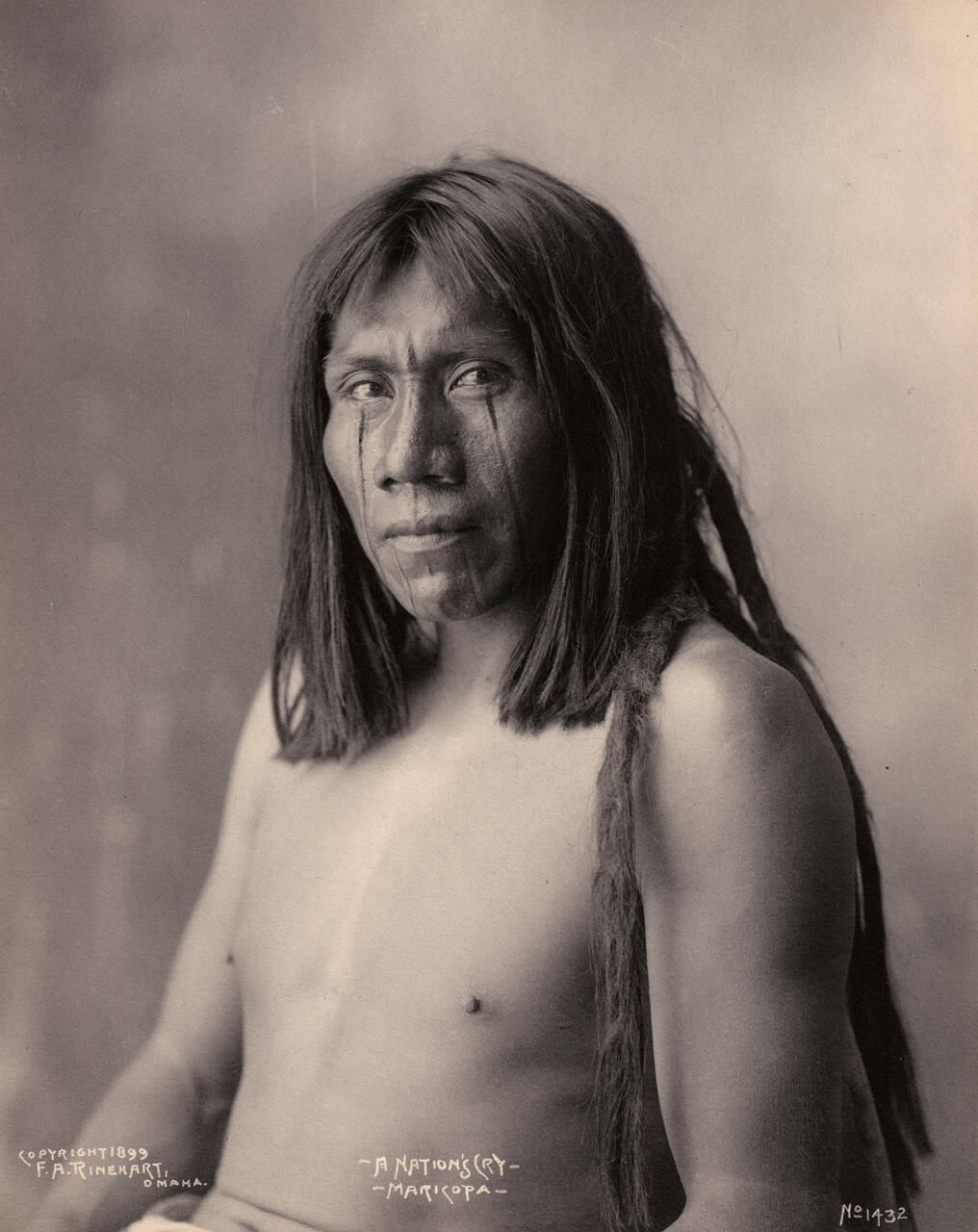 InscribedIn Negative/on image recto, bottom edge: "COPYRIGHT 1899 / F.A. RINEHART, / OMAHA.", "A NATION'S CRY- / -MARICOPA- ", "No 1432"