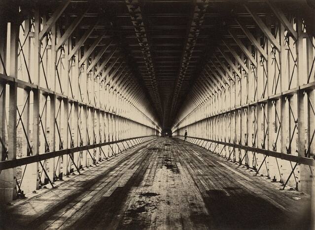 This bold photograph celebrates the engineering might of the era. The Niagara Suspension Bridge, built in 1855 by engineer John Roebling (1806-1869), was 825 feet long, with two decks. The upper deck was for railroad traffic; the lower one (shown here) was used by pedestrians and horse-drawn vehicles. The plunging spatial recession of this image was typical of the visual style of stereo photographers.