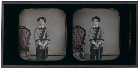 DescriptionStereo image of a child standing next to a tufted chair with hands clasped in front; a rifle is tucked under the child's left arm. This uncased stereo daguerreotype is housed behind reverse painted glass.Published ReferencesSpringfield Daily Republican [Massachusetts] (March 22, 1851): n.p.; Janet E. Buerger, French Daguerreotypes (Chicago: University of Chicago Press, 1989): 108-14; and Bates Lowry and Isabel Lowry, The Silver Canvas: Daguerreotype Masterpieces from the J. Paul Getty Museum (Los Angeles: J. Paul Getty Museum, 1998): 92-93, 220.