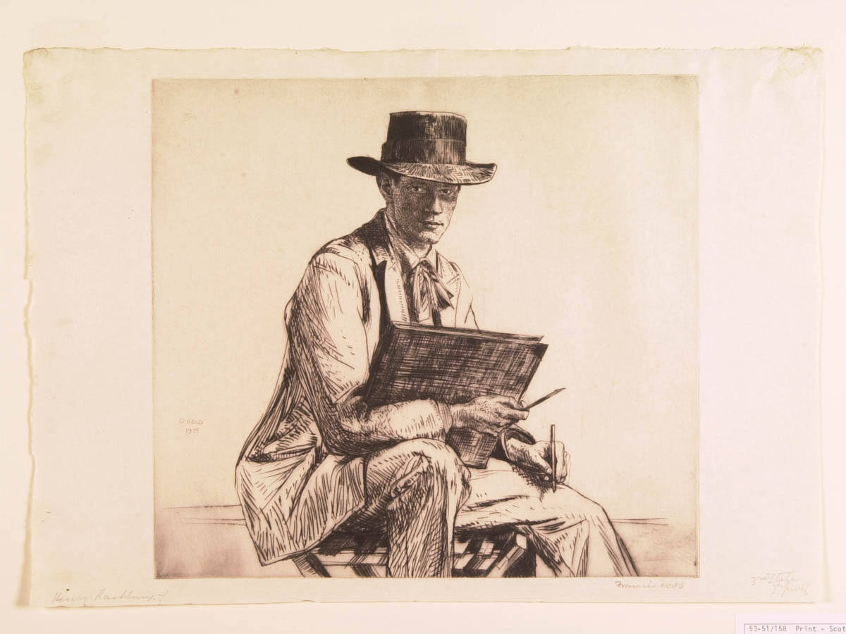 Henry Rushbury, the author of the prison view at San Gimignano, is here portrayed by his teacher Francis Dodd. The sitter is shown with a portfolio, in which he would make sketches that later formed the basis of his etchings. In his hand he holds a pen and a pencil or crayon.