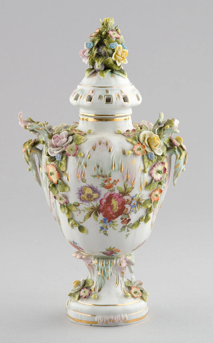 DescriptionVase with painted floral desgins in various colors on sides. Garlands of applied flowers around handles in shades of yellow and rose with green leaves. Lid with cluster of applied flowers on top.