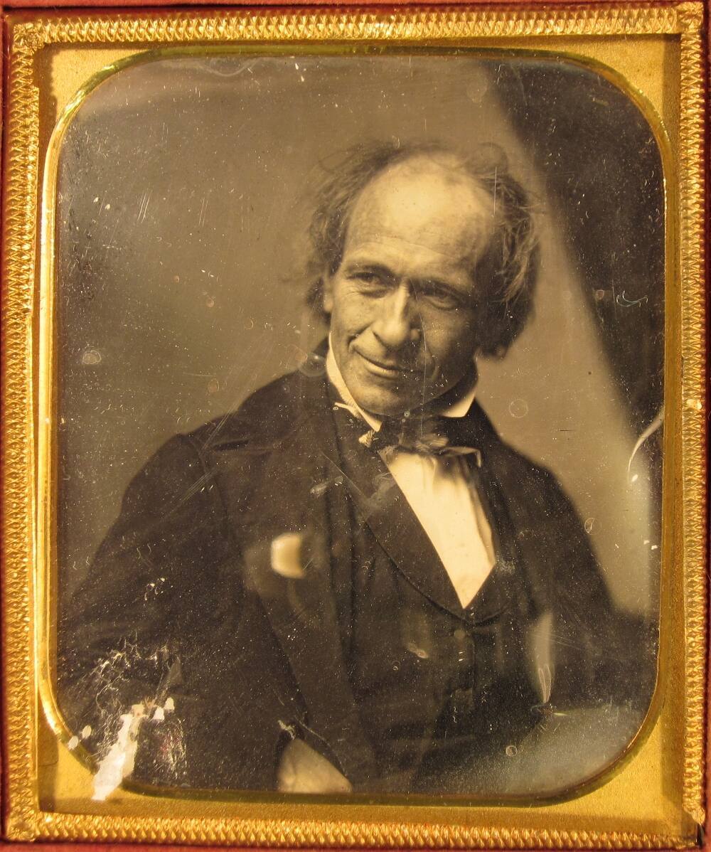 Description1/6 plate daguerreotype portrait of a thoughtful man with his head cocked wearing a bemused smile. Housed in a full leather case with detached top.