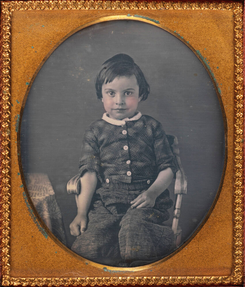 Description1/6 plate daguerreotype of a young boy seated casually in a chair; housed in a full leather case.