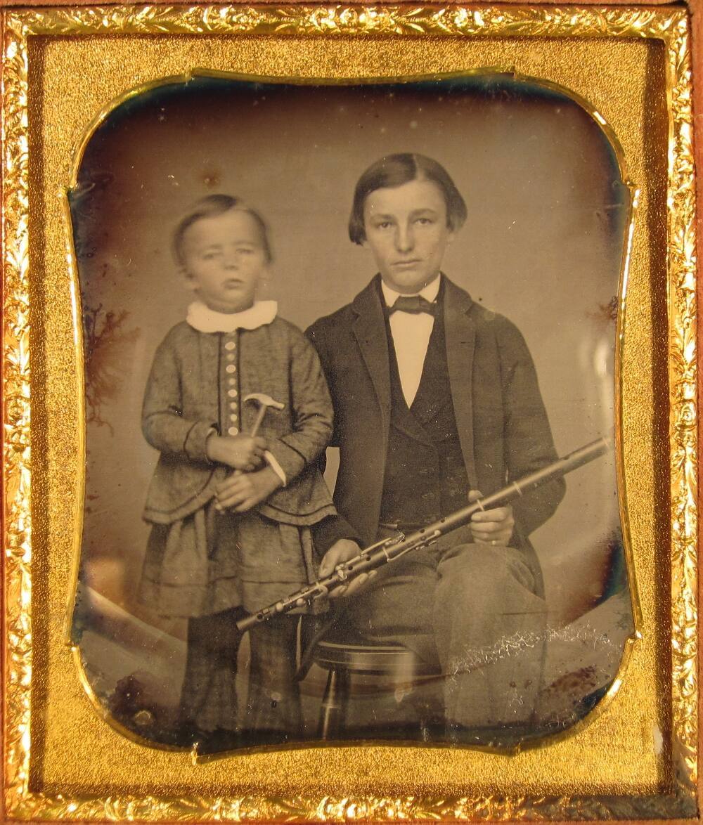 Description1/6 plate daguerreotype of a young man holding a flute. Also pictured is a child holding a toy hammer. Housed in a full leather case with intricate floral design front and back.