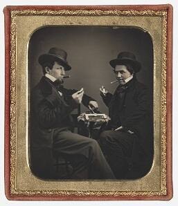 DescriptionSixth plate daguerreotype of two men playing a game of dominoes. Both are wearing what appear to be top hats and smoking cigars. Housed in a full leather case.