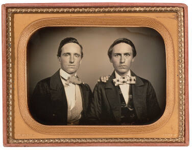 DescriptionImage of two young men wearing suit jackets, vests, and patterned bow ties. One man rests his hand on the other man's shoulder. This quarter plate cased daguerreotype is housed in a brass mat inside of a case with a floral motif and an embossed red velvet liner.Published ReferencesPeter E. Palmquist and Thomas R. Kailbourn, Pioneer Photographers from the Mississippi to the Continental Divide, A Biographical Dictionary, 1839-1865 (Stanford: Stanford University Press, 2005): 220-22; Dolores A. Kilgo, Likeness and Landscape: Thomas M. Easterly and the Art of the Daguerreotype (St. Louis: Missouri Historical Society Press, 1994).