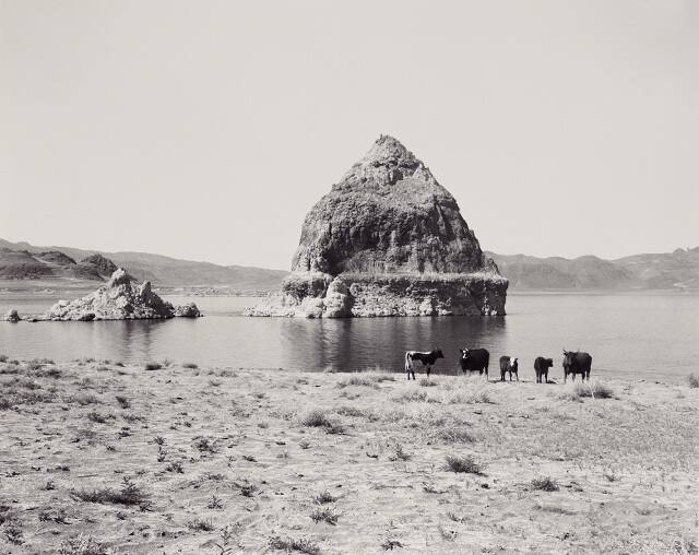 Pyramid Lake was the deepest part of ancient Lake Lahontan, a vast body of water that during the Ice Age covered the majority of northwest Nevada. Today it is located on the Pyramid Lake Pauite Reservation. Ruwedel's title pays homage to Timothy O'Sullivan, who photographed the site in 1867 as part of Clarence King's geological survey. While O'Sullivan was intrigued by the challenge of composing the ancient tufa rock formations in his frame, Mark Ruwedel takes a more distanced view, emphasizing the signs of human settlement as they relate to these primordial geological forms.
