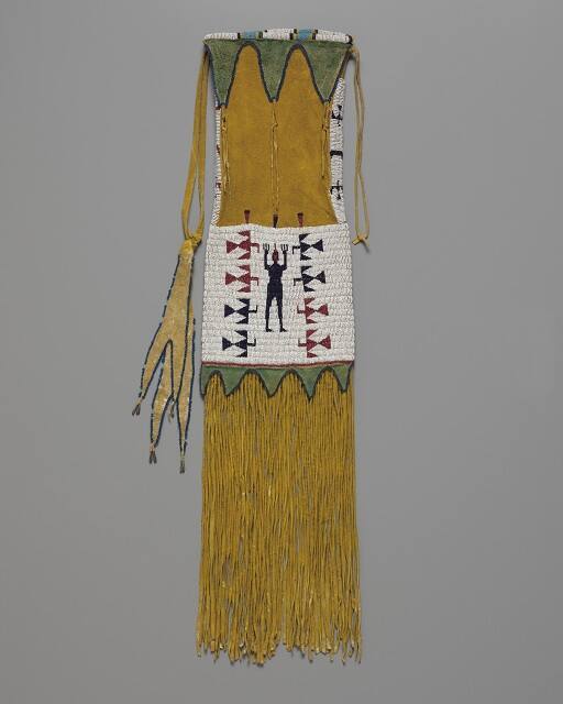 DescriptionVertical leather bag, fringed at bottom below a panel of embroidered glass beadwork depicting a human figure bordered by rows of thunderbirds on a white background.Gallery LabelThe designs on the front and reverse beaded panels of this Cheyenne bag depict a single human surrounded by Thunderbirds—ancient, mythic, powerful spirit-helpers. The image evokes the individual’s search for spiritual guidance, one of the defining features of Plains culture. Here, a man stands with raised arms in the act of prayer, calling for sacred power. The design may also represent the Ghost Dance, where participants danced with outstretched arms in a trance-like state, seeking to see deceased relatives and the new world promised by the religion’s doctrine.