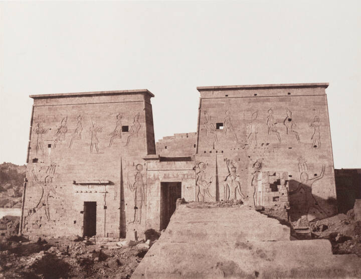 Félix Teynard travelled to Egypt in the 1850s to photograph ancient architectural sites. He modeled his journey on the Description of Egypt, a twenty-three-volume publication compiled to capture and classify Egyptian history following Napoleon’s invasion in 1798. Teynard took this view at Philae, a temple complex located (at the time) on an island in Upper Egypt. Teynard chose a high vantage point and waited for the raking sun to reveal details in the figures carved into the face of a temple. His choice balances the desires to document information and convey an artistic sensibility.