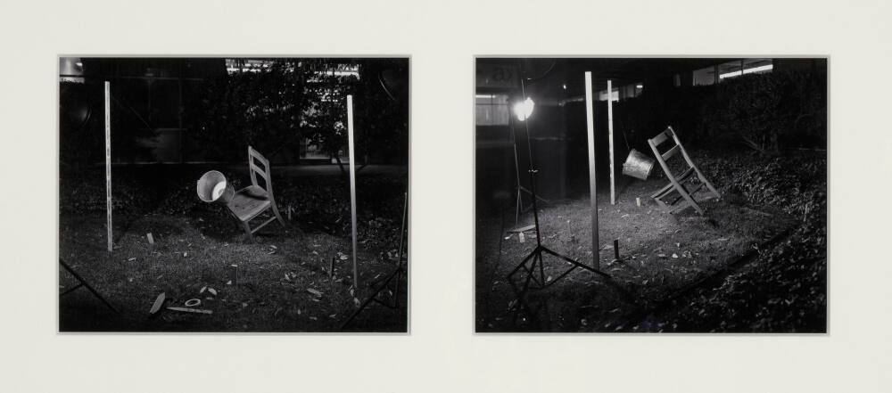 DescriptionA Diptych: Images of a bucket, held up with string between two wooden posts, knocking over a chair. The left image is a view from the front, the right image is a view from the side.Gallery LabelWhen seen from a distance, these two works appear as stop-action photographs of a bucket and chair caught mid-fall, taken from different vantage points. Looking more closely, however, it is apparent that these are props held up by string. The work is a truthful deception: a document of an illusion that makes no effort to hide its trickery.