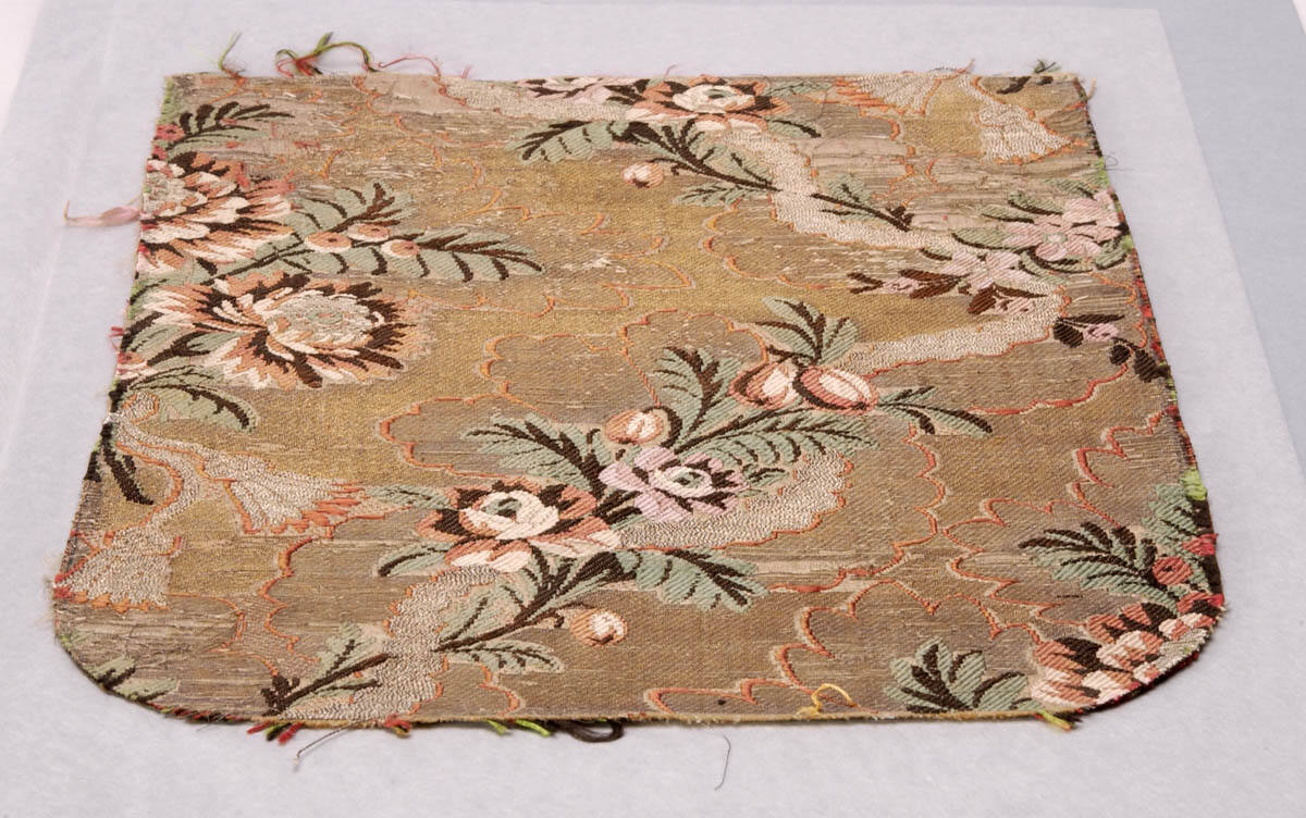 DescriptionPattern of roses and cherries in aprico, white, green, and black on a background of gold and silver.