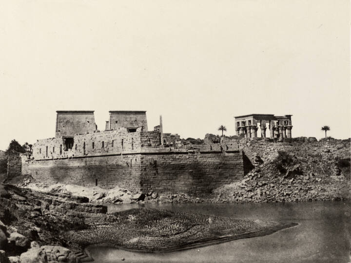 DescriptionA distant view of the Island of Philae, probably taken from the water. There are several temples; one is open with columns and the toher, two large square structures. The complex area was dedicated to the goddess, Isis. Original mountExhibition History