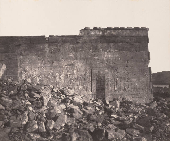 The temple of Dendur, which stands very close to the Nile, is an unfinished religious complex consisting of a temple, a gate and a terrace. Here, Félix Teynard chose an unusual rendering of the side of the temple, with the river just visible on the far right of the image. Under any other condition of daylight, this side of this temple would likely have appeared indistinct; through Teynard’s trained and patient eye, however, it becomes a memorable and enduring edifice rising from a field of rubble. Teynard waited for the correct angle of light that would emphasize an almost calligraphic rendering of the hieroglyphic figures.