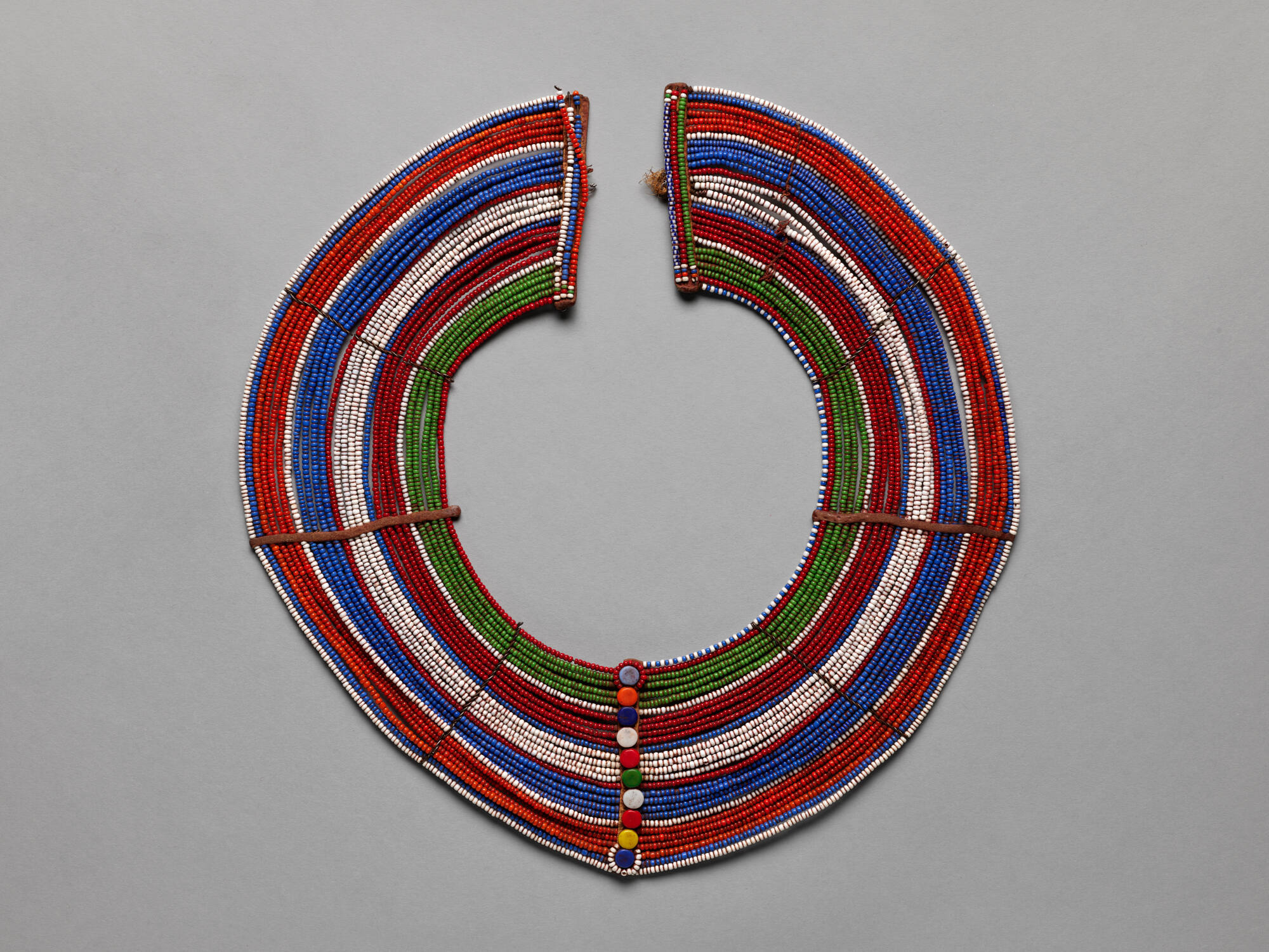 DescriptionNecklace in the form of a flat beaded collar with a simple back opening finished on each edge with three bead strands in light blue, red, and green. Concentric bands of multiple strands of colored beads in red, light blue, white, and green---the Maasai complementary oppositional colors---with each band separated by a contrasting strand of white, red, or light blue beads. The concentric strands are joined together with wire at six points, with the center front of the necklace joined by a row of large, flat beads in light blue, yellow, red, white, green, deep blue, and orange. Two bead strands, of blue and white, form the necklace's outer edge.ProvenanceAcquired in Kenya by Linda M. Livingstone’s father, 1950s [1];