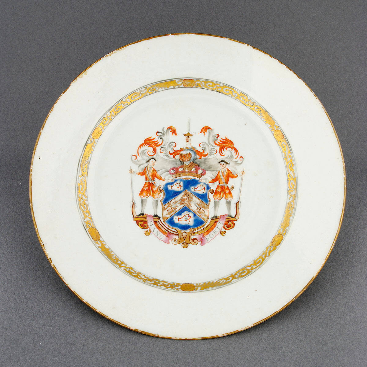 DescriptionPlate with Coat-of-Arms of Baron Reay Mackay in blue, red and gold, consisting of two red-coated figures with rifles on either side of escutcheon with bears the inscription MANU FORTI; gilt scroll and foliate border on cavetto; shoulder is plain except for narrow gold rim.