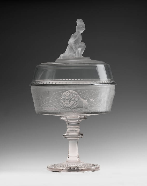 DescriptionKneeling Indian on top; decorative band with a pressed design of log cabin, buffalo and reindeer against Rocky Mountain background.Gallery LabelThis covered compote is formed by pressing almost-liquid glass into molds to create both the shape and relief decoration. Here, the compote is decorated with motifs taken from the American West: bison, Native Americans, log cabins and river boats.