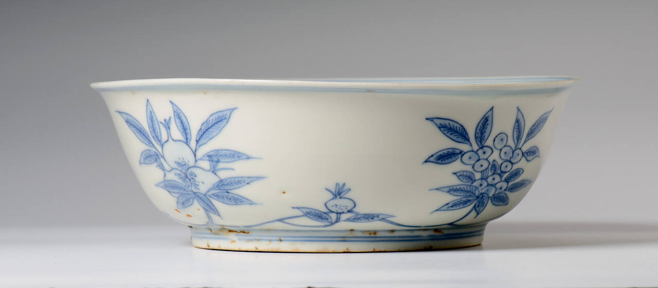 DescriptionBlue and white bowl decorated with fruits on the exterior, and birds and flowers on the interior. With a wooden stand.