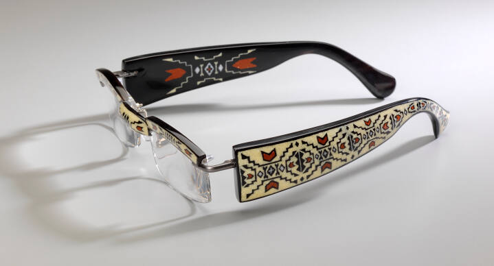 DescriptionConventional reading glasses with frames made of carved highly polished black buffalo horn, inlaid with sandstone and mother-of-pearl in classic Lakota beadwork designs.Gallery LabelWhile these reading glasses are not without humor and irony, particularly with the words “Rez Ban” inlaid on the inner frame, they are also quietly charged with spirituality and traditional associations. According to the artist, the buffalo’s spirit resides within the horn cap, the material that forms the foundation of the frames. The pale yellow and deep red sandstone used for inlay are derived from locations significant in Lakota history and myth, and the abstract, geometric designs reflect older Lakota quill and beadwork motifs.