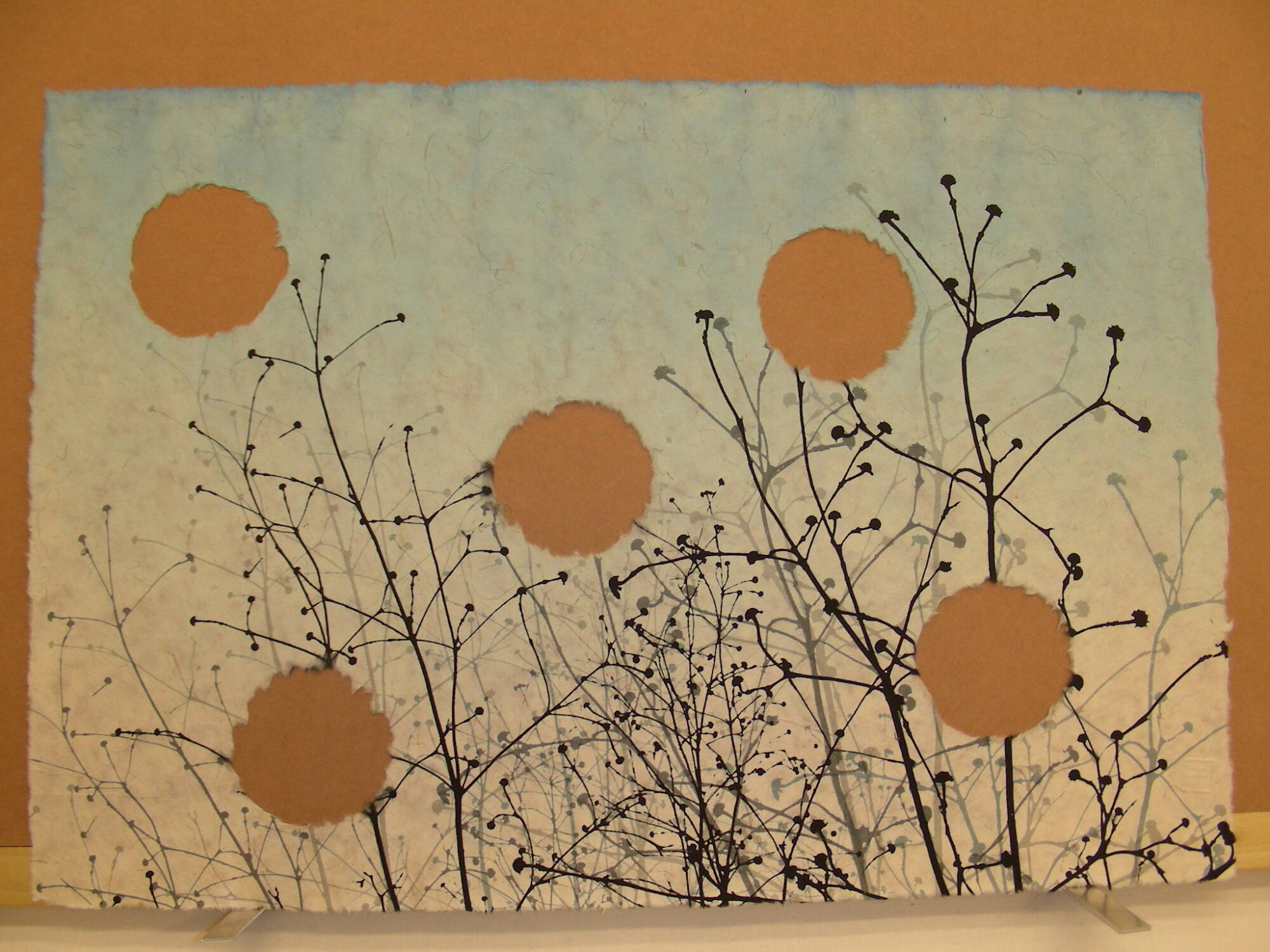 DescriptionBlue sky, branches and five holes, 1-1/2 inch diameter. Print from a portfolio of 35 works by 33 artists from the book "Printmaking at the Edge," published in London, England.Copyright© Maria Anna Parolin