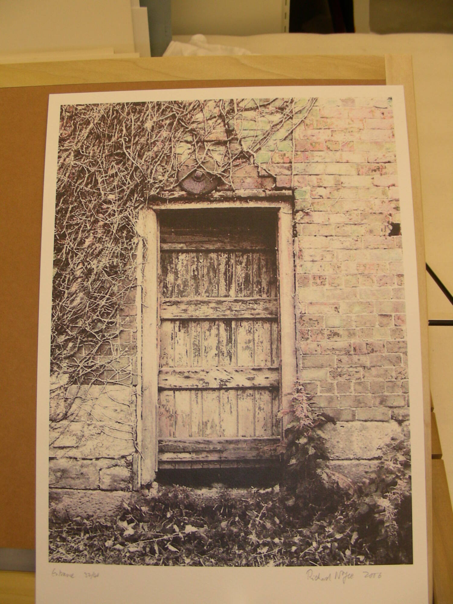 DescriptionWood doorway in center of brick wall. Print from a portfolio of 35 works by 33 artists from the book "Printmaking at the Edge," published in London, England.Copyright© Richard Noyce