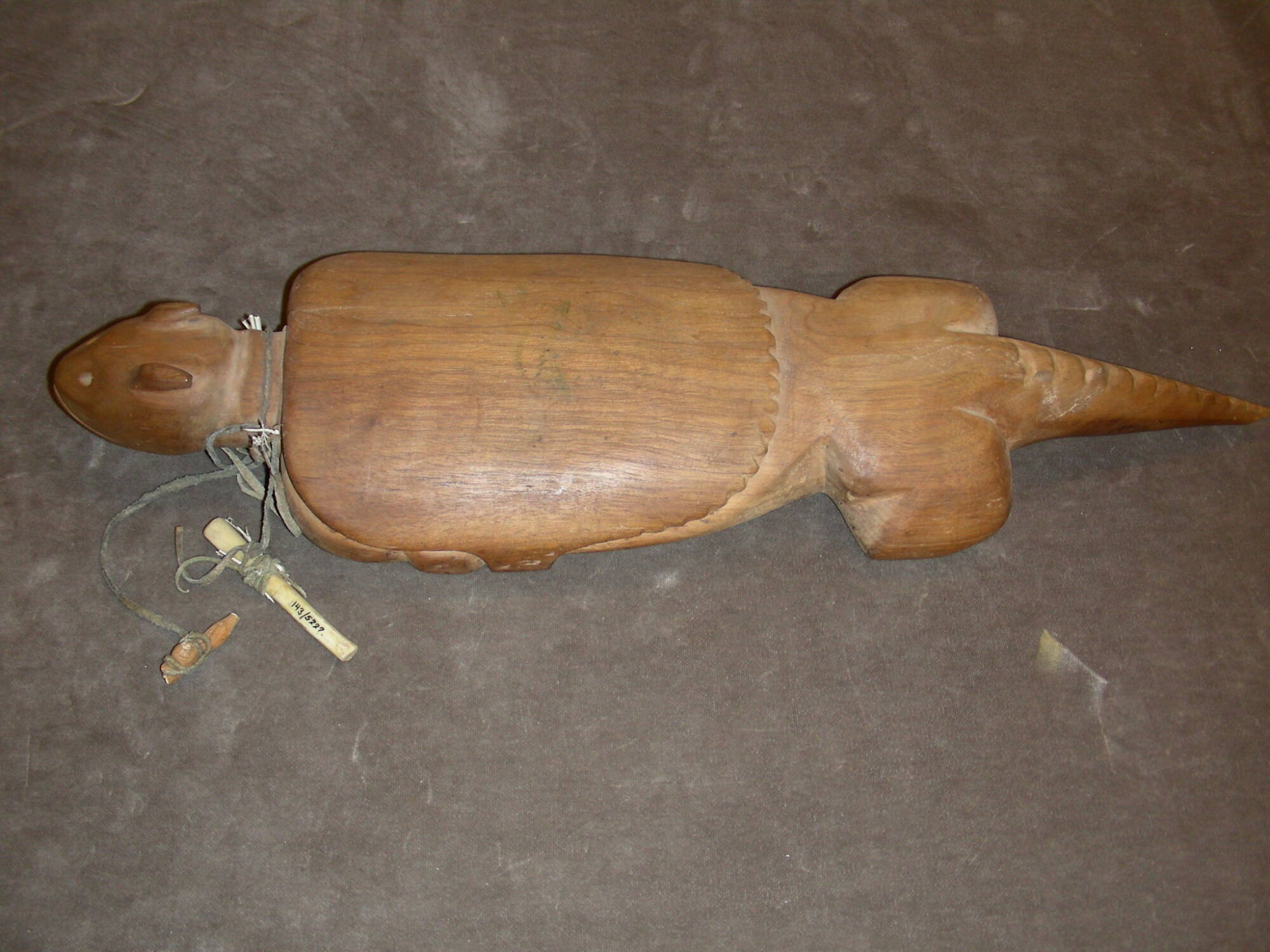 This powerful carving was made by a Mesquakie artist to replicate a sacred object never intended for public display. It represents both a snapping turtle and manitou, or supernatural being, one of the underwater powers inhabiting the Mesquakie cosmos. The object is one of a small number of works created to assist an anthropologist who was studying Mesquakie mythology, religion and material culture. It provided the scholar, and now the outside world, with a view into a sacred realm. The original object is revealed only to appropriate tribal members during ritual use.