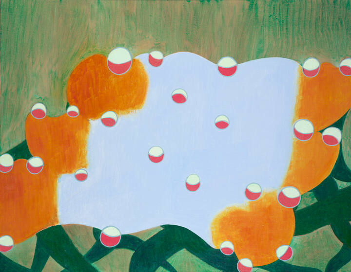 DescriptionThe painting is abstract. At its center is an area of pale lavender-blue. To the right and left edges are three vertically stacked organic shapes painted in orange. The artist has surrounded this confiuration, above and below, with shades of green. Over the blue and orange forms, the artist has superimposed 24 circles, each divided roughtly in half, with one half painted in pal green and the other in bright red-orange.Gallery LabelThomas Nozkowski's paintings, such as Untitled, are colorful biomorphic abstractions of things found in the real world. In each work, as he paints and repaints the same subject, the origins become increasingly obscure. He says, "…each painting has a specific source in the physical world. One of the reasons I do this is to find extraordinary formal devices-colors, shapes, compositions-which I would not have discovered with a strictly formal way of painting."