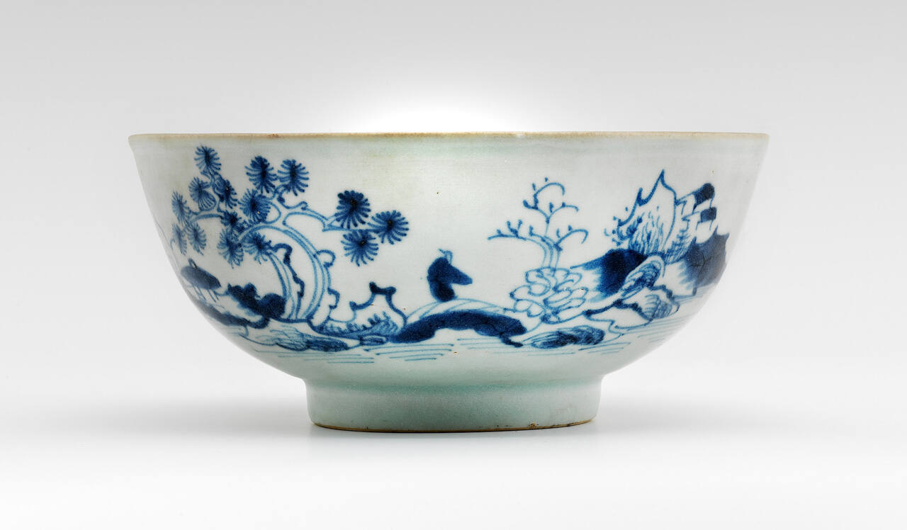 DescriptionWhite porcelain bowl decorated with underglaze blue decoration of a Chinese landscape with figures, bridge, rocks, small building and pine tree and flowers.   The whole surface is rather cloudy or matte.