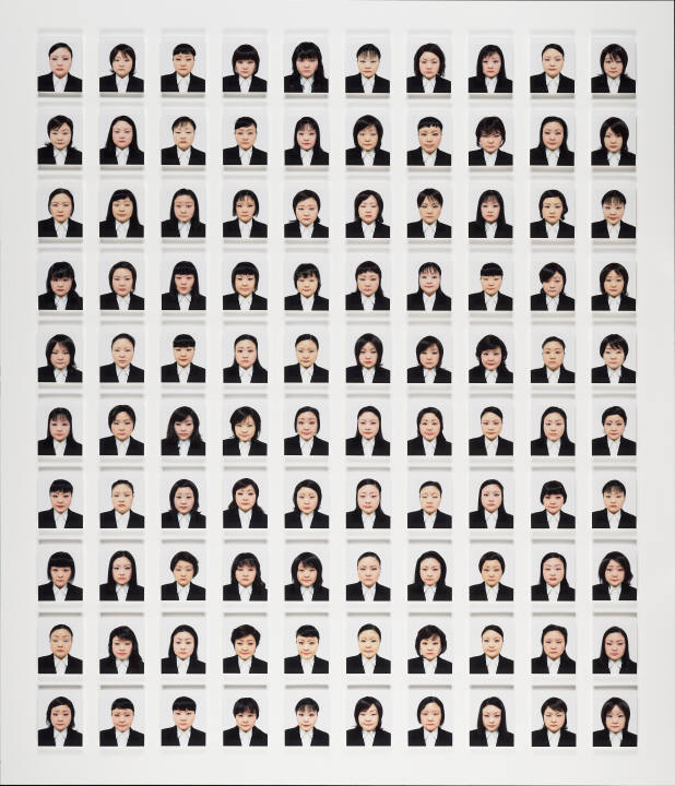 DescriptionImage of 100 passport size photographs of the artist with different hairstyles and expressions but the same white shirt and dark blazer mounted in 10 rows of 10.Gallery LabelFor this work, Tomoko Sawada made 100 passport-sized images of herself dressed in the culturally sanctioned black-and-white corporate attire of her native Japan. Individually, such portraits would typically accompany job applications.