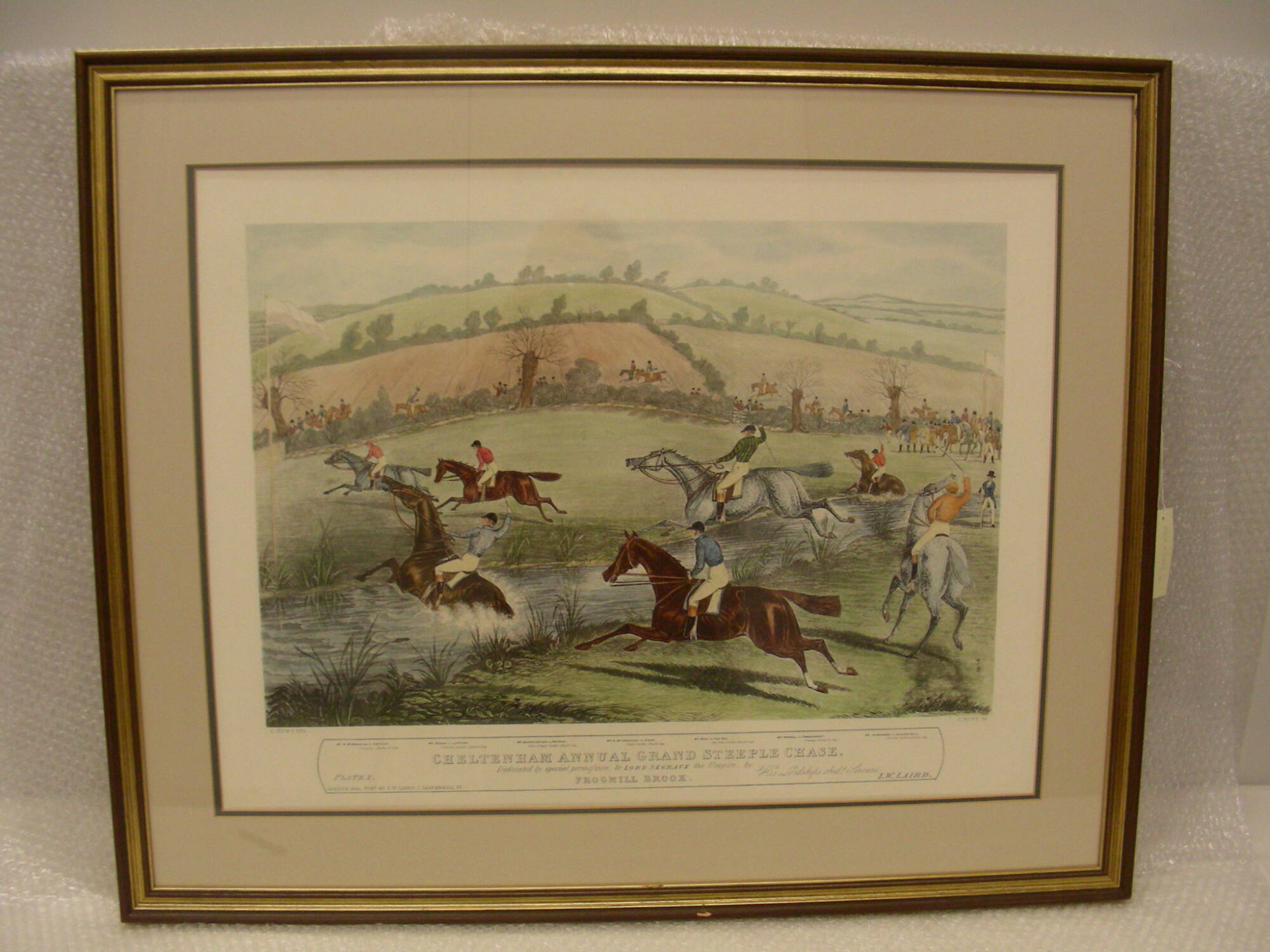 DescriptionHorses and riders in profile galloping across a stream, fields in the distance.Exhibition History[No known exhibitions at this time]